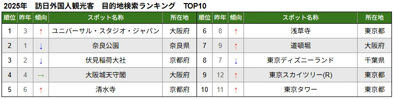 2025年のランキングでは、「ユニバーサル・スタジオ・ジャパン」が1位となり、2位「奈良公園」、3位「伏見稲荷大社」、4位「大阪城天守閣」と続き、上位を関西(大阪・京都・奈良)の観光スポットが占める結果となりました。