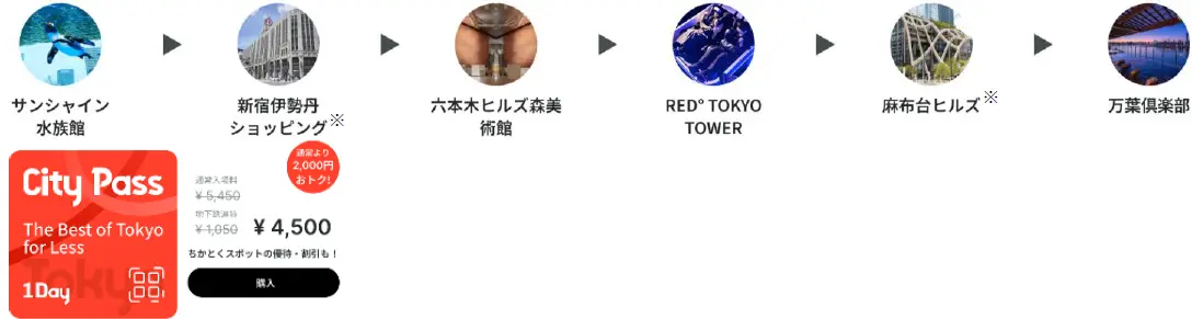 「Tokyo City Pass」購入時に、選択制スポットを選択、予約することができて、また周遊スポットは全施設を予約なしで期間内各1回、利用可能。