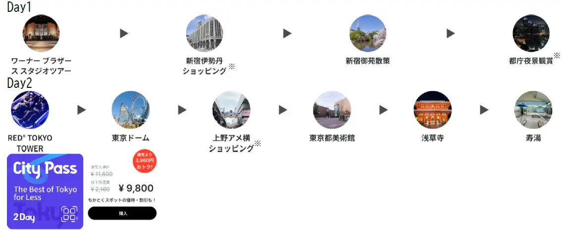 ※1 RED° TOKYO TOWER2,300円、東京ドームシティ アトラクションズ1,000円、寿湯1,000円、浅草寺200円、つきじ丸武200円の合計。