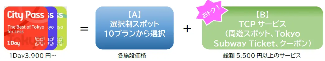 「Tokyo City Pass」は、メインとなる観光施設が選択可能な【A】選択制スポットと、総額5,500円分以上の【B】TCPサービスをセットにして、最低3,900円から利用可能なおトクな観光チケット。