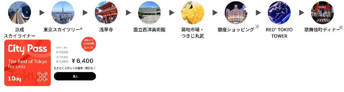 「Tokyo City Pass」は、①東京スカイツリーや東京タワー、チームラボプラネッツTOKYO DMM.comなどの東京を代表する観光スポット(選択制スポット)と、②浅草寺で線香をあげる体験や昔ながらの銭湯に入る体験など、訪日外国人旅行者に人気の東京観光スポット(周遊スポット)、③東京の地下鉄乗り放題の乗車券「Tokyo Subway Ticket」、④クーポンがセットになった観光チケット。